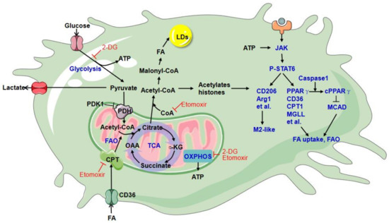- Zhang, Q.; Wang, H.; Mao, C.; Sun, M.; Dominah, G.; Chen, L.; Zhuang, Z. Fatty acid oxidation contributes to IL-1β secretion in M2 macrophages and promotes macrophage-mediated tumor cell migration. Mol. Immunol. 2018, 94, 27–35. [Google Scholar] [CrossRef]