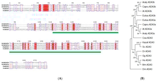 To identify homologues of yeast ADA3 in the Arabidopsis thaliana genome, we used the yeast Ada3 protein sequence as a query to search in protein sequences from the plant kingdom. Two potential candidates were observed, named ADA3a (At2g19390) and ADA3b (At4g29790). Previous works identified only At4g29790 as the yeast and human ADA3 homologue [,]. These proteins include a domain that resembles the ADA3 domain of other organisms (Figure 1A). The ADA3 domain from several eukaryotic organisms was used to construct a phylogenetic tree. The tree separates the ADA3 plant group into two smaller subgroups, demonstrating that, contrary to other eukaryotes, in Arabidopsis thaliana two genes encode proteins that resemble yeast ADA3 (Figure 1B). The deduced AtADA3a and AtADA3b polypeptides consist of 1211 amino acids and have predicted molecular weights of 133.36 and 133.24 kDa, respectively, and share 75% amino acid sequence identity. The predicted secondary structure of the two proteins indicates that the N terminus of ADA3 proteins has a conserved coil–coil domain followed by a nuclear localization signal. In the center of the protein, from approximately 580 through 720 aa, a putative a/b hydrolase domain was detected followed by the ADA3 domain, from 743–970 aa. The ADA3 domain was predicted to have six b-strands and five a-helices, with a putative DNA and RNA binding domain. Finally, the C-terminus is conserved and expected to have a b-strand structure (Figure S2). The two genes that encoded putative ADA3 proteins also exist in other plants, including relatives of Arabidopsis (Figure S3). Phylogenetic analysis of Viridiplantae putative ADA3 proteins revealed that ADA3 is absent only in chlorophytes. The first appearance of ADA3 protein was observed in charophytes, such as Klebsormidium nitens and Chara braunii, followed by liverworts, mosses, and lycophytes, ANA clade, monocots, and eudicots (Figure 2) []. Searching for motifs in ADA3 polypeptide sequences in plant models, including Arabidopsis, Brachypodium, Amborella, Selaginella, Physcomitrella, and Marchantia indicated that the primary structure of the ADA3 proteins is highly conserved (Figure S4). Both ADA3a and ADA3b are expressed in most organs and tissues, but ADA3b has higher levels of expression than ADA3a (Figure S5). The subcellular localization of ADA3a was predicted to be nuclear, whereas for ADA3b the prediction was nuclear and cytoplasmic (Figure S6).
