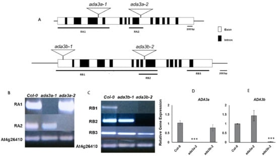 Schematic diagram of the Arabidopsis ADA3 genes (A), with ADA3a shown at the top and ADA3b shown below. Exons are denoted as white boxes, and triangular schemes indicate the position of the T-DNA insertion creating each mutant allele. The numbered horizontal bars below the ADA3a and ADA3b genes schematic refer to the coding sequence assayed in (B) and (C). Reverse-transcriptase (RT)-PCR of ADA3a and ADA3b transcripts (B,C). Plant genotypes are indicated at the top of each column, and the amplified fragments of the ADA3a transcript (B) or ADA3b transcript (C) are shown to the left of each row. RT-PCR of At4g26410 were used as controls for cDNA amount and quality. Real-time RT-qPCR analysis of ADA3a (D) and ADA3b (E) transcripts in wild type Col-0, ada3a-2 and ada3b-2 10 days-old, soil-grown plants, under long day conditions. Statistical significance calculated by t-test, *** p < 0.001.