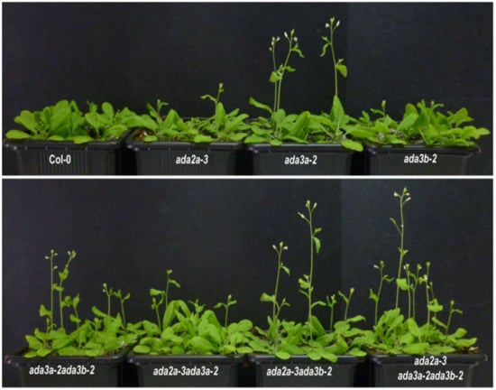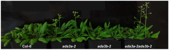 The effect of ADA2a, ADA3a, and ADA3b on flowering. Four-week-old Col-0, ada2a-3, ada3a-2, ada3b-2, ada3a-2ada3b-2, ada2a-3ada3a-2, ada2a-3ada3b-2, and ada2a-3ada3a-2ada3b-2 mutant plants grown under long-day conditions.