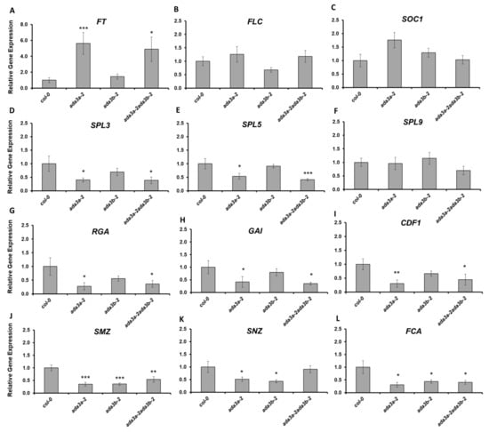 To explore the molecular mechanisms by which ADA3a affects flowering, we monitored the expression of several flowering-related genes [] by RT-qPCR (Figure 6). The flowering promoting gene FT was highly overexpressed in ada3a-2 and ada3a-2ada3b-2 mutants but not in the ada3b-2 mutant, confirming the early flowering phenotype and suggesting that ADA3a is a negative regulator of FT gene expression (Figure 6A). The gene expression levels of the negative regulator FLC and positive regulator SOC1 were similar in the mutants and the wild type plants, indicating that the ADA3a and ADA3b did not affect their levels (Figure 6B,C). SQUAMOSA promoter binding protein-like (SPL) genes are involved in vegetative phase transitions and regulated by the Arabidopsis SAGA-like complex []. To test if SPLs gene expression is also affected by ADA3a and ADA3b, we analyzed the gene expression of SPL3, SPL5, and SPL9 (Figure 6D–F). The expression of SPL3 and SPL5 was significantly reduced in ada3a-2 and ada3a-2ada3b-2 in comparison to wild type and ada3b-2 single mutant plants (Figure 6D,E). This result indicates that ADA3a affects SPL3 and SPL5 expression in a positive manner. Notably, the expression levels of SPL9 were not affected by mutations in ADA3a and ADA3b (Figure 6F). Next, we analyzed the expression of two DELLA genes that are involved in GA signaling and affect flowering in Arabidopsis. Both RGA and GAI were downregulated in ada3a-2 and ada3a-2ada3b-2 (Figure 6G,H), suggesting that ADA3a is a positive regulator of RGA and GAI gene expression. The FT locus receives multiple signals from different pathways []. To further investigate how the gene expression of FT was affected, we analyzed the expression of negative regulators of FT in ada3a and ada3b mutant plants. The expression of CYCLING DOF FACTOR 1 (CDF1), a gene that suppresses the expression of CONSTANS (CO) and FT [], was significantly reduced in ada3a-2 and ada3a-2ada3b-2 (Figure 6I). Other FT repressors include two transcription factors of the RAV family; TEMPRANILLO1 (TEM1) and TEMPRANILLO2 (TEM2) and four genes of the euAP2 lineage; SCHLAFMUTZE (SMZ), SNARCHZAPFEN (SNZ), TARGET OF EAT1 (TOE1), and TOE2 []. The TEM1 and TEM2 genes had no change in their expression in the ada3a and ada3b mutant plants (Figure S9), while the expression of TOE1 and TOE2 was significantly downregulated in the ada3a-2ada3b-2 double and ada3a-2 single mutants, respectively (Figure S8). Interestingly, the expression of SMZ and SNZ was reduced in both ada3a-2 and ada3b-2 single mutants, and SMZ was also downregulated in ada3a-2ada3b-2 (Figure 6J,K). This result indicates that the gene expression of several FT repressors is affected by ADA3a and ADA3b function. Finally, the expression of the FCA gene from the autonomous pathway [] was significantly reduced in both single and the double mutants (Figure 6L) indicating that FCA could also be a target of ADA3a and ADA3b. Overall our data suggested that mainly ADA3a affects the expression of many flowering related genes from different pathways.