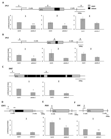 The acetylation status of H3K14 in the Arabidopsis thaliana Col-0 and ada3a-2 ten-days old plants. (A) Three genomic regions for the SPL3 and (B) SPL5 locus were analyzed: near the transcription start site (1), in the protein-coding region (2), and after the 3′ untranslated region (3). (C) Two genomic regions were analyzed for the SMZ locus: one near the transcription start site (1), and one in the protein-coding region (2). (D) One genomic region was analyzed for the CDF1 locus, near the transcription start site, (E,F) for the RGA and GAI locus, within the 5′ untranslated regions. Values were obtained by q-PCR as a percentage of input. Antibody for histone H3 was used as an internal control, and the ratio (percentage of input with H3K14ac/percentage of input with H3) is presented. The error bars represent standard error (SE) of three technical repeats. Statistical significance was calculated by t-test, * p < 0.05, ** p < 0.01, *** p < 0.001.