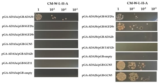 Yeast two hybrid (Y2H) assays were performed using the Matchmaker Gold System (Takara, Shiga, Japan). cDNA fragments encoding putative members of the plant SAGA complex, ADA3a, ADA3b, SGF29a, SGF29b, TAF12b, and SGF11, were PCR amplified from the pda04096 (RIKEN), U14407, U11423, U82343, U11077, and U12870 plasmids obtained by ABRC. Primers were designed using the SnapGene® software under default parameters (Table S1). PCR amplification was performed with high fidelity Q5 polymerase (New England Biolabs). All the plasmids used in the Y2H were constructed using a Gibson Assembly® kit (New England Biolabs, Ipswich, MA, USA), according to the manufacturer’s instruction. Both vectors (pGBKT7 and pGADT7) were cut by NdeI and BamHI (New England Biolabs, Ipswich, MA, USA) to create linear plasmid with sticky ends. The constructed plasmids were transformed into E. coli cells, which were plated on LB Agar plates with the appropriate antibiotic depending on the plasmid. Plasmids were then isolated using a NucleoSpin® Plasmid kit (Macherey-Nagel, Duren, Germany). GCN5, ADA2a, and ADA2b in pGBKT7 and pGADT7 were described by []. The yeast strain AH109 was transformed with pGBKT7 containing studied bait genes, while the Y187 was transformed with pGADT7 vector containing the prey genes of interest. Yeast cultures were grown in low stringency medium and diluted to an optical density at 600 nm (OD600) of 1.0. Tenfold serial dilutions (10-fold, 100-fold, and 1000-fold) were made in sterile H2O, and 10 μL of each was plated on high stringency media and allow to grow for 5 days at 30 °C. Yeast cells carrying pGBKT7 empty vectors were used as negative controls, while yeast cells carrying ADA2a-AD and GCN5-BD, as well as ADA2b-AD and GCN5-BD fusion proteins, were used as positive controls [].