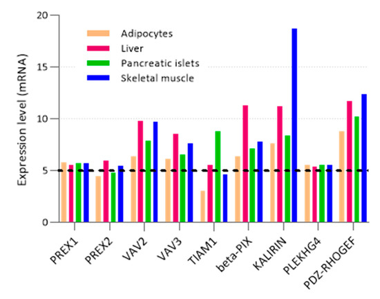 Figure 3. Metabolic tissue distribution of mammalian Rho GEFs that are known to be involved in the regulation of glucose homeostasis. Nine mammalian Rho GEFs are currently known to regulate glucose homeostasis in vitro or in vivo. Their distribution in human metabolic tissues is shown here, as extracted from public database BioGPS (http://biogps.org, accessed on 10 April 2021) [74]. Data are mean mRNA expression values determined by Affymetrix microarray. Units are z-scores of mean fluorescence intensity, determined using multiple probes for each transcript and processed using gcrma algorithms. Genes with z-scores above 5, indicated by the stippled black line, are considered to be expressed in that tissue. The graph was drawn using GraphPad Prism 8.