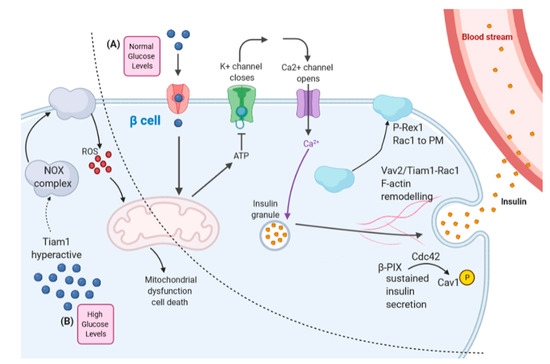 Figure 5. The roles of Rho family GEFs in pancreatic β cell glucose homeostasis. (A,B) depict normal and un-physiologically high glucose conditions, respectively, separated by the dashed line in the figure. (A) Under conditions of normal glucose homeostasis in the pancreatic β cell, glucose entry mediates insulin secretion. Vav2 and Tiam1-Rac1 have been implicated in remodeling the F-actin cytoskeleton to enable this secretory process [42,98]. P-Rex1 was implicated in glucose-induced insulin secretion and shown to aid in Rac1 localization at the plasma membrane (PM) under high-glucose conditions [77]. β-PIX competes with caveolin-1 (Cav1) for binding to Cdc42 and activates Cdc42 as part of the secondary sustained phase of insulin secretion. (B) Stress-related levels of glucose (or fatty acids) lead to the apoptotic death of pancreatic β cells and a diabetic phenotype, and this is possibly linked to hyper-activation of the Tiam1–Rac1 pathway. Figure made with BioRender.