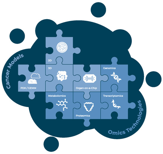 Cancer models and omics technologies to obtain a comprehensive picture of biological processes within a patient’s tumor. An appropriate combination of different omics technologies and relevant tumor models allows a more comprehensive analysis of intra-tumor heterogeneity, relevant to improve patient treatment. (PDX—patient-derived xenograft; GEMM—genetically engineered mouse models; 2D—two-dimensional cell culture; 3D—three-dimensional cell culture).