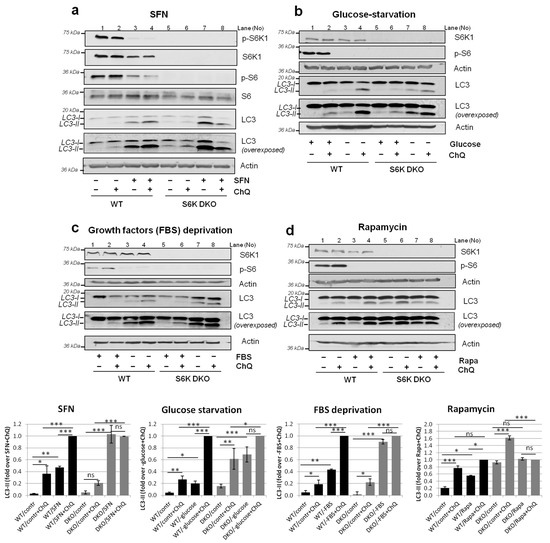 Cells treated with SFN or growth factor-deprived cells were lysed in a solution containing 50 mM Tris, 1% Triton X-100, 150 mM NaCl, 0.5 mM EDTA, and protease and phosphatase inhibitor cocktails (Roche Diagnostics, Basel, Switzerland). The lysates were cleared by centrifugation at 15,500× g for 20 min. Proteins were resolved by sodium dodecyl sulfate polyacrylamide gel electrophoresis and transferred onto a polyvinylidene fluoride membrane. The membrane was blocked with 5% (w/v) non-fat dry milk in PBS, and incubated with the desired primary antibody overnight at 4 °C. It was then washed and treated with the appropriate secondary antibody for 1 h at room temperature. Immunoreactive bands were detected using an enhanced chemiluminescence reagent (Thermo Scientific, Waltham, MA, USA). The blots were stripped and re-probed with an anti-actin or anti-GAPDH antibody, as appropriate, to normalize for differences in protein loading. Immunoreactive band intensity was determined after densitometric scanning, using Quantity One software (BioRad, Hercules, CA, USA) to quantify protein levels. For each protein, densitometric data were corrected for the loading difference and presented as a fold-change from the reference, control WT MEF, with the exception to LC3-II protein. In case of LC3-II, to make the measure of autophagic flux independent from differences in total LC3 level between cell lines (WT and S6K DKO MEF), the LC3-II level in cells under different autophagy-inducing conditions and ChQ in each line served as separate reference. The experiments were performed in triplicate.