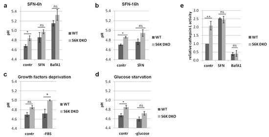 Figure 2. The absence of S6K kinases does not perturb lysosomal function under stress conditions. The impact of S6K status on lysosomal pH (ad) and cathepsin L activity (e) was analyzed. WT and S6K DKO MEF were treated with 20 µM SFN for 6 h (a), 16 h (b), or 3 h (e), or deprived of growth factors for 6 h (c) or glucose for 3 h (d). Control cells (contr) were treated with the vehicle (DMSO; a,b,e) or grown in a complete medium (c,d). Cathepsin L activity and pH were measured as described in Materials and Methods (Section 2.7 and Section 2.9, respectively). Cells treated with bafilomycin A1 (BafA1; 100 nM) served as a positive control. The data are shown as the mean ± SEM. Statistical significance was determined by one-way ANOVA followed by Bonferroni’s multiple comparison test: * p < 0.05, ** p < 0.01; ns, not significant. The experiments were performed in three independent replicates.