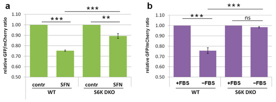 Figure 3. Lack of S6K kinases affects autophagosome-lysosome fusion in cells stressed by SFN exposure or by growth factor deprivation. (a) Impact of 20 µM SFN (6 h) or (b) growth factor deprivation (−FBS; 24 h) on GFP/mCherry fluorescence intensity ratio in WT or S6K DKO MEF stably overexpressing GFP-mCherry-LC3, (as described in Materials and Methods). Control cells (contr) were treated with the vehicle (DMSO; a) or were grown in FBS-supplemented medium (b). The experiment was performed in three independent replicates. The data are shown as the mean ± SEM. Statistical significance was determined by one-way ANOVA followed by Bonferroni’s multiple comparison test: ** p < 0.01, *** p < 0.001; ns, not significant.