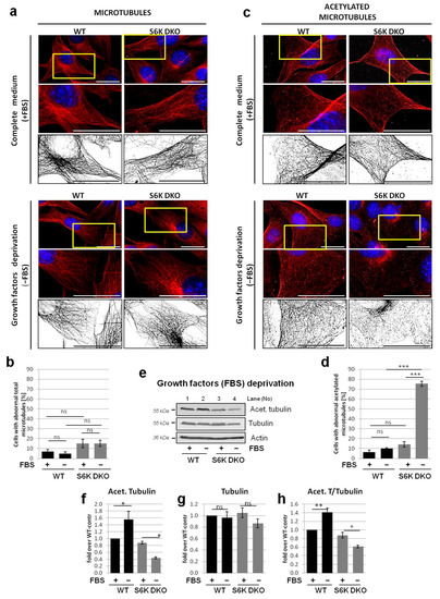 Figure 5. Lack of S6K affects the acetylated but not the total microtubule network in cells deprived of growth factors. Total (a,b) and acetylated microtubule network (c,d) was investigated by immunofluorescent staining of total α-tubulin (a) or acetylated tubulin (b), respectively, in WT and S6K DKO (DKO) MEF growing in a complete medium (control; +FBS) or deprived of growth factors (−FBS) for 16 h. The cells were stained using mouse antibodies against α-tubulin (a) or acetylated tubulin (Lys40) (b), followed by staining with goat anti-mouse–TRITC conjugates. DNA was stained with DAPI (blue). The indicated sections of original images are enlarged (middle panels), and for clarity, deconvoluted and transformed into inverted grey scale (bottom panels). Representative images of cells analyzed in at least 10 random fields per experiment are shown. Scale bar = 25 µm. Approximately 100 cells per sample were counted in three independent replicates. The percentage of cells with a diffused, depolymerized (abnormal) microtubule (b) and acetylated microtubule (d) network was counted and graphed (mean ± SEM). Statistical significance was determined by one-way ANOVA followed by Bonferroni’s multiple comparison test: ** p < 0.01, *** p < 0.001; ns, not significant. (e) Acetylated tubulin and total α-tubulin levels were evaluated by western blotting in WT and S6K DKO MEF grown in a complete medium (control; +FBS) or a medium deprived of growth factors (−FBS) for 16 h. The blots were re-probed with anti-β-actin antibodies to ensure equal protein loading. Densitometric data of acetylated tubulin (f) and tubulin (g) levels, corrected for loading control, as well as acetylated tubulin to total tubulin ratio (h) are presented as a fold-change from the reference, the control WT MEF (lane 1). The experiment was performed in three independent replicates. The data are shown as the mean ± SEM. The statistical significance of differences was determined by one-way ANOVA followed by Bonferroni’s multiple comparison test: * p < 0.05, ** p < 0.01, *** p < 0.001; ns, not significant.
