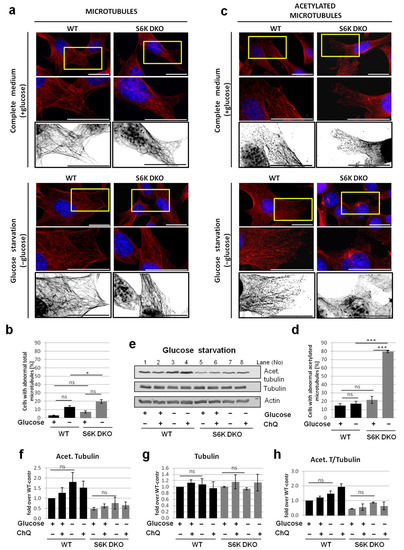 The impact of another stressor, glucose starvation, on microtubule morphology was also assessed (Figure 6). Similarly to serum-deprived cells, we did not observe significant differences in total microtubule morphology (Figure 6a,b). In the case of acetylated microtubules, the cytoskeleton was more delicate and less dense in S6K DKO MEF under basal conditions, but did not differ significantly from that observed in WT MEF (Figure 6c,d). However, when the cells were glucose-starved, the acetylated cytoskeleton density increased in WT cells, while it was negligent in S6K DKO MEF. Further, glucose starvation resulted in a notable (although not statistically significant) increase in tubulin acetylation in WT MEF but not in S6K DKO MEF (Figure 6e,h). The presence of chloroquine did not affect tubulin acetylation.