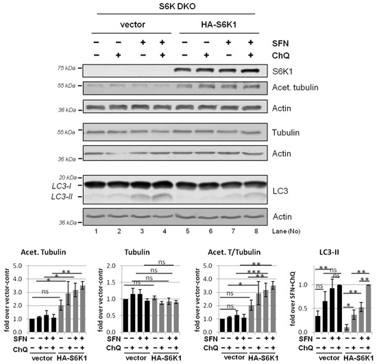 To confirm the unexpected role of S6K1 in the control of tubulin acetylation (and, in turn, autophagic flux), we performed rescue experiments by transiently transfecting S6K DKO MEF with an S6K1-encoding plasmid (the impact of S6K2 on autophagy was previously excluded [30]). To evaluate the autophagic flux, the cells were treated with SFN or the vehicle in the presence or absence of chloroquine. Indeed, reintroduction of S6K1 improved autophagic flux in SFN-treated S6K DKO MEF (Figure 7 and [30]). This was accompanied by an increase of acetylated tubulin levels, particularly in SFN-treated cells. This effect was not apparent in cells transfected with the control vector, confirming that S6K1 plays an essential role in the regulation of tubulin acetylation and is necessary for its enhancement under stress conditions.