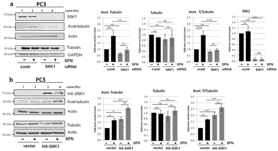 Figure 8. Modulation of tubulin acetylation by S6K1 is conserved in different cellular models. Prostate cancer cells (PC3) were transfected with (a) a control or S6K1-targeting siRNA, or (b) a control or HA-S6K1–encoding vector (b). The cells were treated with DMSO (control) or SFN for 3 h. Acetylated tubulin, S6K1, and HA-S6K1 protein levels were evaluated by western blotting. The blots were re-probed with anti-β-actin antibodies to ensure equal protein loading. Graphs next to immunoblots show densitometric data, corrected for loading control and presented as fold-changes from the reference, untreated control cells (lane 1). The experiment was performed in three independent replicates. The data are shown as the mean ± SEM. The statistical significance of differences was determined by one-way ANOVA followed by Bonferroni’s multiple comparison test: * p < 0.05, ** p < 0.01, *** p < 0.001; ns, not significant.