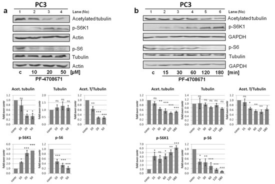 Figure 9. Modulation of tubulin acetylation by S6K1 is dependent on its phosphorylation status. Prostate cancer cells (PC3) were treated (a) for 3 h with the indicated concentrations of PF-4708671, or (b) with 10 µM PF-4708671 for the indicated time periods. The control cells (c) were treated with the vehicle (DMSO). Acetylated tubulin, tubulin, p-S6K1 (Thr389), and p-S6 protein levels were evaluated by western blotting. The blots were re-probed with anti-β-actin or anti-GAPDH antibodies to ensure equal protein loading. Graphs below immunoblots show densitometric data, corrected for loading control and presented as a fold-change from the reference (control; line 1). The experiments were performed in three independent replicates and representative blots are shown. The data are shown as the mean ± SEM. The statistical significance of differences between control and treated cells was determined by one-way ANOVA followed by Dunnett’s multiple comparison test: * p < 0.05, ** p < 0.01, *** p < 0.001; ns, not significant.