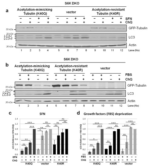 Figure 10. Overexpression of an acetylation-mimicking but not acetylation-resistant variant of tubulin restores autophagic flux in stressed S6K DKO MEF. The impact of the overexpression of acetylation-mimicking (K40Q) or acetylation-resistant (K40R) GFP-tubulin variants on autophagic flux during stress induced by SFN (20 µM; 3 h) (a,c) or growth factor deprivation (−FBS; 24 h) (b,d) in S6K DKO MEF was evaluated by immunoblotting. Cells transfected with an empty vector served as a control. To assess the autophagic flux, chloroquine (ChQ; 10 µM), a lysosomal inhibitor, was added for the last 2 h of treatment, as indicated. GFP-tubulin and LC3 protein levels were evaluated by western blotting. The blots were re-probed with anti-β-actin antibodies to ensure equal protein loading. Densitometric data, corrected for loading control, are shown as a fold-change from the reference, i.e., the cells transfected with the control, acetylation-mimicking (K40Q) or acetylation-resistant (K40R) GFP-tubulin vector, and treated with SFN + ChQ (lane 8, 4 and 12, respectively) (a,c) or deprived of FBS + ChQ (lane 12, 4 and 8, respectively) (b,d). The experiments were performed in three independent replicates. The data are shown as the mean ± SEM. The statistical significance of differences was determined by one-way ANOVA followed by Bonferroni’s multiple comparison test: * p < 0.05; ** p < 0.01, *** p < 0.001; ns, not significant.