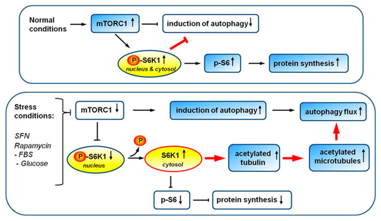 One of the purposes of the current study was to address the question of why S6K1 is needed only under stress conditions and the underlying mechanism. An increasing body of evidence suggests that microtubule acetylation is an important link between stress and autophagy [7,14,64]. Under standard conditions (basal autophagy), the two microtubule motor proteins, kinesin (anterograde intracellular transport) and dynein (retrograde intracellular transport), participate in autophagosome trafficking toward the lysosome. However, under stress conditions, the only motor protein responsible for autophagosome transport and the subsequent autophagosome-lysosome fusion is dynein [14,15,65]. This might be related to the observation that, upon stress, lysosomes concentrate in the perinuclear region of the cell [66]. Of note, binding of dynein to microtubules is increased upon microtubule acetylation, while increased acetylation is a general cell response to stress ([7,14] and Figure 4, Figure 5 and Figure 6). Furthermore, inhibition of dynein under stress conditions results in an impaired autophagic flux [14,15,65,67]. Data presented in the current study indicate that cellular S6K1 deficiency disturbs the process of microtubule acetylation. This, in consequence, might block the binding of dynein to microtubules and inhibit autophagosome trafficking to the lysosome. Since S6K1 affects microtubule acetylation only under stress conditions, this might explain why the absence of S6K1 under standard, basal, conditions does not interfere with the autophagic flux.