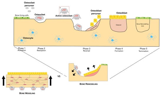 Bone remodeling is essential for structural integrity, biomechanical stability, bone volume and calcium/phosphate homeostasis [,,]. In normal adult bone, there is a homeostatic balance in which bone resorption is followed by bone formation for maintaining bone strength and mineral homeostasis, keeping the overall bone volume and structure unchanged [,]. By this process, about 10% of the skeleton may be renewed every year []. That is, bone remodeling only takes place when it is required, either because the specific area is damaged and/or old.