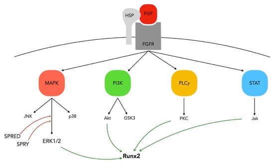 FGFs can activate several MAPKs such as C-Jun N-terminal kinase (JNK), ERK, and p38MAPK [], that share many structural similarities, while inducing different responses [,]. The ERK1/2 branch, one of the major routes for FGF signaling [], promotes a mitogenic response and is observed in all cell types, while p38 and JNK kinase are usually associated with inflammatory and stress responses [,] and are mainly involved in the cell cycle, cytoskeleton and cell migration []. For instance, FGF-2 regulates mesenchymal stem cell migration [] via the PI3K-AKT pathway, neural progenitor cell proliferation via PI3K/GSK3 signaling [], and fibroblast migration via PI3 kinase, Ras-related C3 botulinum toxin substrate 1 (Rac1) and JNK [], as well as promoting bone marrow MSC proliferation through the ERK1/2 pathway []. Activation of the MAPK pathway, in response to FGF-2 signaling, is key in determining the activity of RUNX-2, a master transcription factor of bone formation []. FGF-2 promotes osteoblast proliferation and differentiation [], through the activation of the ERK1/2 pathway [,,] and a crucial role of this pathway has been identified in the differentiation of osteoblasts and chondrocytes [,,,]. Specifically, MAPK phosphorylates Runx-2 Ser/Thr residues, a critical step for Runx2 acetylation and stabilization against degradation []. Sprouty (SPRY) and Sprouty related (SPRED) are two antagonists of this pathway [,] that act as intracellular antagonists of FGFR signaling, the first by suppressing ERK1/2 activation [] and the second by suppressing rapidly accelerated fibrosarcoma (Raf) activation [] (Figure 3).