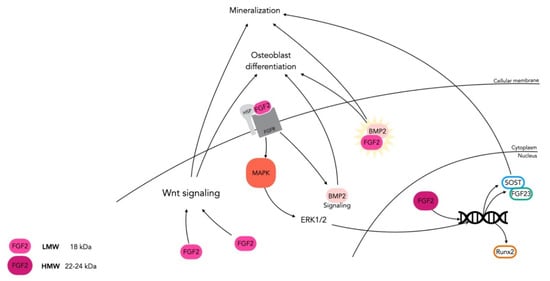 FGF/FGFR signaling in bone—FGF-2 is highly expressed in bone tissues. There is a high molecular weight (HMW) form, located in the nucleus, that acts as a transcriptional factor, and upregulates the expression of SOST and FGF-23 responsible for inducing mineralization. The low molecular weight (LMW) form is cytoplasmic or membrane associated. The latter can promote osteoblast differentiation and mineralization through the Wnt pathway, BMP-2 signaling, or synergistic action with BMP-2. By activation of FGFR signaling, LMW FGF-2 also activates MAPK-ERK/2, which acts as a transcriptional factor that upregulates mineralization genes such as RUNX2.