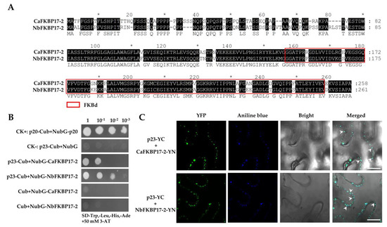 The full-length cDNAs coding for NbFKBP17-2 and CaFKBP17-2 were cloned from N. benthamiana and C. aurantifolia, respectively. NbFKBP17-2 and CaFKBP17-2 shared 82% amino acid identity and each contained a FKBd (Figure 1A). Yeast split-ubiquitin assays showed that the yeast cells transformed with paired vectors p20-Cub and NubG-p20 (a positive control), p23-Cub and NubG-CaFKBP17-2, and p23-Cub and NubG-NbFKBP17-2 were able to grow on selective media (SD-Trp,-Leu,-His,-Ade) complemented with 50 mM 3-AT, whilst two yeast transformants individually carrying p23-Cub+NubG and Cub+NubG-FKBP17-2 were unable to grow (Figure 1B), indicating that the p23 can interact with both CaFKBP17-2 and NbFKBP17-2.