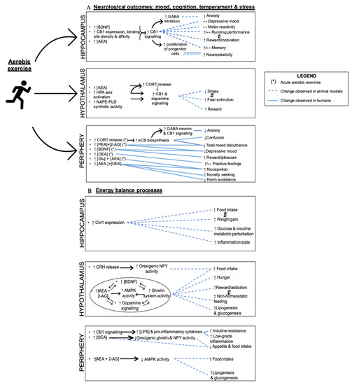 The main objective of the present work is to provide an in-depth examination of ECS-mediated neurobiological mechanisms of aerobic exercise, with emphasis on its molecular and cellular aspects. In addition to these central functions of eCB signaling, many others have been described, including feeding, energy homeostasis, mood, learning memory, growth, development, and reward processes, which have mainly been investigated in rodent models. The peripheral ECS functional pathways discussed in this review are multiple and also include, among others, the regulation of inflammation and gut-barrier functions [13], considering gut microbiota also has a tangible impact on gut-brain communications as well as mental functions [14,15,16].