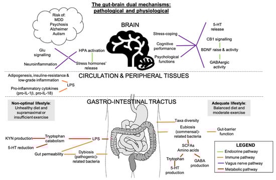 Intensified and prolonged exercise stimuli were suggested to be deleterious for intestinal permeability, creating shifts in the metabolic profiling and functions of the gut microbiota [104,105], accelerating the appearance of neuropathologies [106]. In fact, strenuous exercise, with manifestations similar to overtraining, increases stress hormones and LPS translocation outside the gut to surrounding tissues, thereby increasing pro-inflammatory cytokines and intestinal permeability, inflammation, and gut permeability being inseparable [107], and declining GABA-mediated inhibitory homeostasis [5]. A physically demanding military environment would change gut microbiota composition and decrease gut-barrier functions associated with the enhancement of inflammation markers among young adults, independently from the diet [108]. Additionally, 23% of stool metabolites following prolonged physiological stress were linked to changes in gut microbiota composition [108]. An excessive physical demand can thus oppose the intestinal and mental adaptations of an adequate amount of exercise and can lead to cognitive susceptibility and physical performance decrement [108]. In opposition to excessive and overintense exercise, regular physical activity has been shown to affect the gut microbiota by inducing taxa that can beneficially affect metabolism, inflammation, cognitive outcomes [109], and chronic pain [84,85].