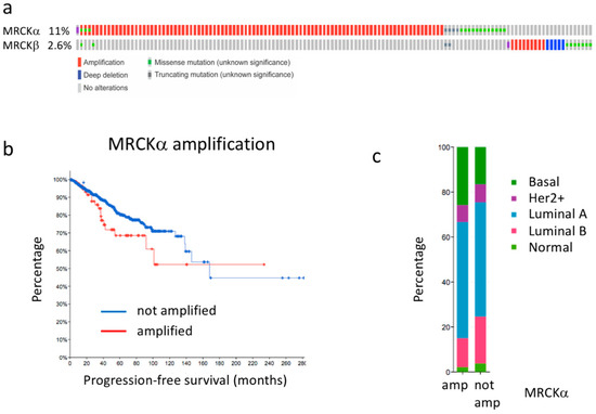 MRCKα gene is amplified in breast cancer. (a) Genetic alterations of the MRCKα and MRCKβ genes in breast cancer. (b) Progression free survival of breast cancer patients with amplified and non-amplified MRCKα gene (p = 0.087). (c) Breast cancer subtype distribution of patients with amplified (amp) and not amplified (not amp) MRCKα gene. All graphs were generated in cBioPortal.org using the TCGA PanCancer Atlas data set for invasive breast carcinoma (accessed on 20 March 2021).