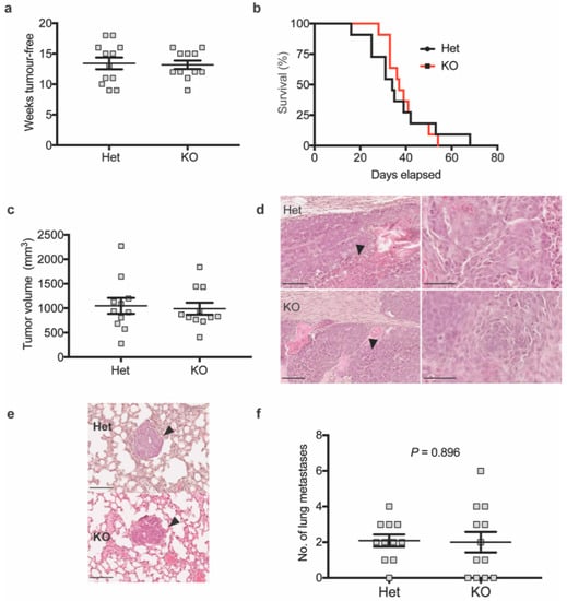 Surprisingly, loss of MRCKα did not affect the tumor onset, tumor-free survival and tumor volume (Figure 4a–c). Histological analysis of tumors in KO and Het control mice indicated adenocarcinoma characterized by increased size of nuclei, nuclear pleomorphy, prominent nucleoli and areas of necrosis in more advanced carcinoma (Figure 4d). Occasional infiltration of mononuclear cells and desmoplasia were observed. Tumors appeared relatively solid without single cells or small groups of cells detached from the main tumor. Western blot analysis of tumors confirmed the lack of MRCKα and showed no clear compensatory upregulation of MRCKβ (Supplementary Figure S2a). In one of 6 KO tumors, MRCKα expression was even decreased. Frequency and histology of lung metastases was similar in Het and KO mice (Figure 4e,f).