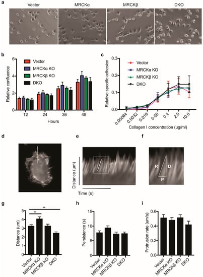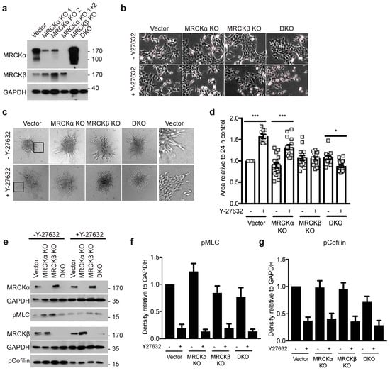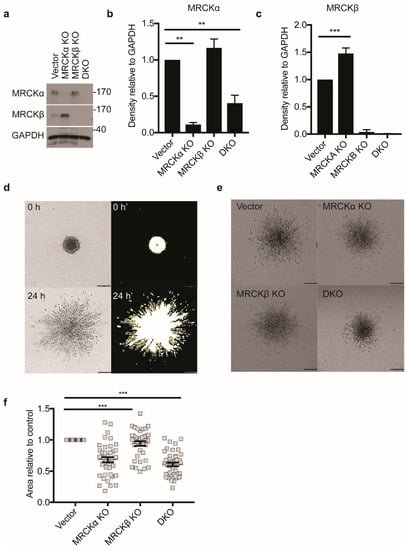 MDA-MB-231 breast cancer cells lacking MRCKα, MRCKβ, or both (DKO) were established by lentiviral CRISPR genome editing and selection for stably transduced cells. As a control, MDA-MB-231 cells were transduced with the empty vector. Control MDA-MB-231 cells expressed primarily the high molecular weight isoforms of MRCKα and MRCKβ (Figure 5a). Even without clone picking, the efficiency of gene deletion was very high as tested on protein level (Figure 5a–c). Interestingly, KO of MRCKα resulted in a slight but significant increase in MRCKβ expression. On the other hand, loss of MRCKβ did not affect MRCKα protein levels to a significant extent.