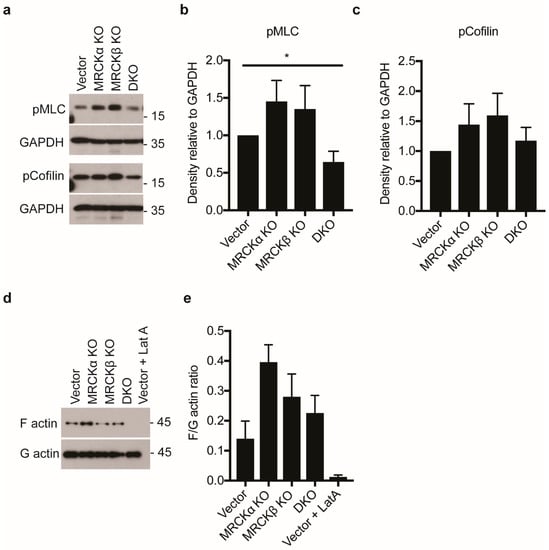 Earlier, MRCKα and MRCKβ were shown to regulate together with ROCK the phosphorylation of cofilin and myosin light chain (MLC), corresponding to increased F-actin formation and increased cell contraction. Unexpectedly, in our MDA-MB-231 cells neither in MRCKα KO nor in MRCKβ KO a decrease in pMLC, pCofilin, or F-actin was detectable (Figure 7a–e). They rather appeared to be increased in MRCKα KO MDA-MB-231 cells, although the differences were not significant. DKO cells showed slightly reduced pMLC compared to vector transfected controls.