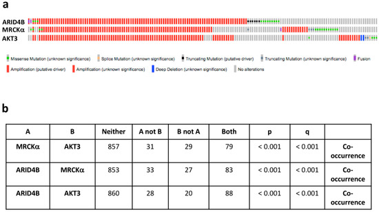 MRCKα is co-amplified with ARID4B and AKT3. (a) Oncoprints of genomic alterations of MRCKα, ARID4B and AKT3 in human breast cancers. (b) Analysis of co-occurrence of MRCKα with the oncogenes ARID4B and AKT3. All analyses were generated in cBioportal (TCGA PanCancer Atlas, breast cancer samples, accessed on 20 February 2021).