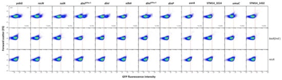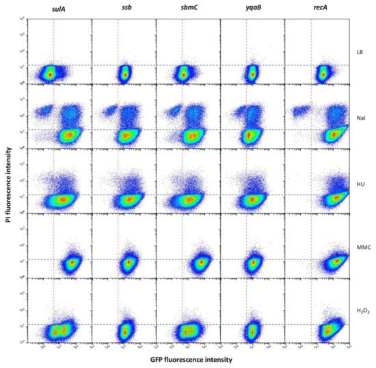 To monitor gene expression under SOS inducing conditions, cultures were exposed to DNA damaging agents nalidixic acid [44], hydroxuyrea [61], mitomycin C [62] and oxygen peroxide [63]. Propidium iodide (PI), a DNA-binding dye for which only cells with a damaged membrane are permeable [41], was used to detect dead cells. In the heat maps obtained by flow cytometry analysis, four types of bacterial cells could thus be detected: SOSOFF alive (GFP− PI−), SOSOFF dead (GFP− PI+), SOSON alive (GFP+ PI−) and SOSON dead (GFP+ PI+). The loci chosen for these experiments belonged to groups I, II and III as well as to the miscellaneous group showing individual gene expression patterns, and representative examples are shown in Figure 7. Relevant observations can be summarized as follows: