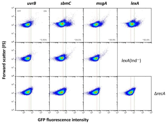 Figure 3. Formation of LexA dependent and LexA-independent ON subpopulations in genes of group III. The pink dashed line shows the boundary between OFF and ON states, established as the expression level of a non-fluorescent sample (Supplementary Figure S2).