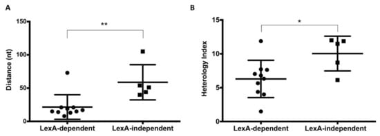 (A). Correlation between LexA-dependent and LexA-independent bistability and the distance of the SOS box. Statistically significant differences are shown (p-value: * p < 0.05; ** p < 0.01). (B). Correlation between LexA-dependent and LexA-independent bistability and the heterology index (HI) of the SOS box. In genes that show LexA-dependent bistability and have more than one LexA box (recN, dinI and lexA), only the closest LexA box with lower HI was considered.