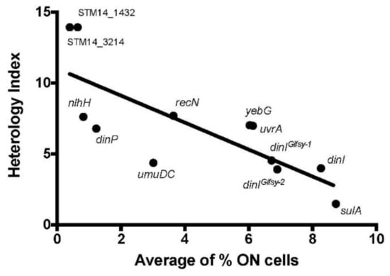 After observing an influence of the heterology index of the LexA box on the gene expression pattern, we wondered if there was any relationship between the predicted LexA affinity and the size of the subpopulation of cells that expressed the gene under non-inducing conditions. Contrary to our expectations, genes with lower HI (and therefore with predicted higher LexA affinity) were those that presented larger ON subpopulations (Figure 5).
