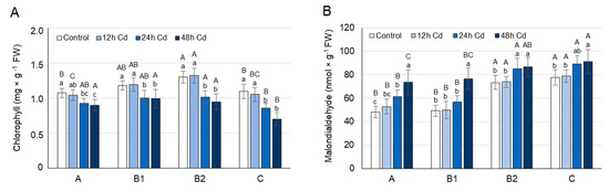 Levels of chlorophyll and malondialdehyde (MDA), an end product of lipid peroxidation [55], can reflect the degree of stress/membrane damage induced by Cd. Therefore, changes in the chlorophyll (a + b) and MDA concentrations over time were analyzed in the leaves of pea plants after 12, 24, and 48 h of growth on media containing 50 µM CdCl2. The analyses were performed on leaves at different stages of development: the youngest unexpanded leaves (A), the youngest fully expanded leaves (B1), the fully expanded mature leaves (B2), and the oldest true leaves (C).