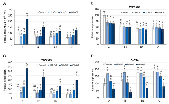 Changes in the proline concentration (A) and transcript level of PsP5CS1 (B), PsP5CS2 (C), and PsPDH1 (D) after 12, 24, and 48 h of Cd treatment. Cadmium was applied as 50 µM CdCl2. The relative mRNA level in individual leaves was expressed in relation to that in A leaves of control plants, set to 100, after normalization to reference genes. A, the youngest unexpanded leaves; B1, the youngest fully expanded leaves; B2, fully expanded mature leaves; and C, the oldest true leaves. The results are the means (±SD) of three biological replicates. Significant differences (at least p < 0.05) between the means are shown above the columns by different letters: lowercase between different time points in a group of leaves with the same stage of development, and capital between leaves with different stages of development but at the same time point.
