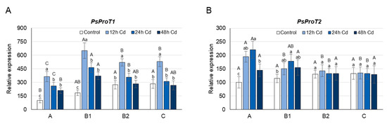 Changes in the transcript level of PsProT1 (A) and PsProT2 (B) after 12, 24, and 48 h of Cd treatment. Cadmium was applied as 50 µM CdCl2. The relative mRNA level in individual leaves was expressed in relation to that in A leaves of control plants, set to 100, after normalization to reference genes. A, the youngest unexpanded leaves; B1, the youngest fully expanded leaves; B2, fully expanded mature leaves; and C, the oldest true leaves. The results are the means (±SD) of three biological replicates. Significant differences (at least p < 0.05) between the means are shown above the columns by different letters: lowercase between different time points in a group of leaves with the same stage of development, and capital between leaves with different stages of development but at the same time point.