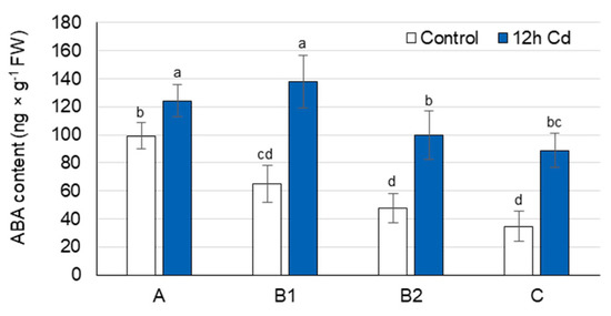 Changes in the abscisic acid concentration after 12 h of Cd treatment. Cadmium was applied as 50 µM CdCl2. A, the youngest unexpanded leaves; B1, the youngest fully expanded leaves; B2, fully expanded mature leaves; and C, the oldest true leaves. The results are the means (±SD) of three biological replicates. Different letters above the columns indicate significant differences between the means (p < 0.05).