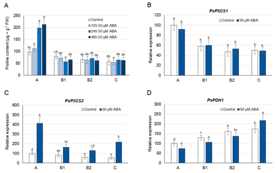Changes in the proline concentration (A), abscisic acid (ABA) concentration (B), and transcript levels of PsP5CS2 (C) and PsPDH1 (D) after 24 h of ABA treatment. ABA was applied at a concentration of 50 µM. The relative mRNA level in individual leaves was expressed in relation to that in A leaves of control plants, set to 100, after normalization to reference genes. A, the youngest unexpanded leaves; B1, the youngest fully expanded leaves; B2, fully expanded mature leaves; and C, the oldest true leaves. The results are the means (±SD) of three biological replicates. Different letters above the columns indicate significant differences between the means (p < 0.05).