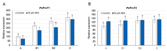 Changes in the transcript levels of PsProT1 (A) and PsProT2 (B) after 24 h of ABA treatment. ABA was applied at a concentration of 50 µM. The relative mRNA level in individual leaves was expressed in relation to that in A leaves of control plants, set to 100, after normalization to reference genes. A, the youngest unexpanded leaves; B1, the youngest fully expanded leaves; B2, fully expanded mature leaves; and C, the oldest true leaves. The results are the means (±SD) of three biological replicates. Different letters above the columns indicate significant differences between the means (p < 0.05).