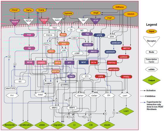 Pulmonary Arterial Adventitial Fibroblast (PAAF) mechanosignaling network with 8 input stimuli (orange ovals), 6 receptors (triangles), 34 nodes (ovals), 7 transcription factors (rectangles), 6 messenger RNAs (hexagons), and 8 phenotypic outputs (green diamonds), modified from our previous work [12]. Activation is shown with arrows and inhibition is shown with blunt head arrows. Blue arrows indicate non-PAAF-based experiments. Magenta nodes indicate the Phosphoinositide 3-kinase (PI3K) pathway, orange nodes indicate the Reactive Oxygen Species (ROS) pathway, purple nodes indicate the mitogen-activated protein kinase (MAPK) pathway, blue nodes indicate the calcineurin pathway, and red nodes indicate the Hippo signaling pathway.