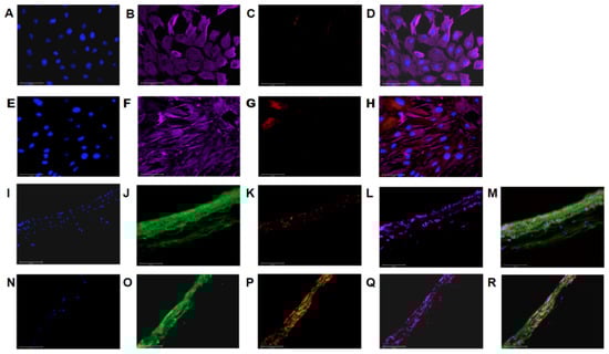 The cell culture showed positive labeling for (A,E) DAPI, (B,F) vimentin, (C) vWF, and (G) MYH11 with (D,H) overlays. Out of 425 isolated cells, 3% expressed vWF, and out of 888 cells, 0.2% expressed MYH11 and 100% expressed vimentin with representative images shown in (A–H). Immunostained PA tissue sections showed positive labeling for: (I) DAPI, (J) WGA, (K) vWF, (red), and (L) vimentin(magenta) with an (M) overlay. Separate immunostained PA tissue sections showed positive labeling for: (N) DAPI, (O) WGA, (P) MYH11 (orange), and (Q) vimentin (magenta) with an (R) overlay. These samples were used as labeling controls to estimate purity of a cell culture expanded on plastic. Images were all acquired at 40× magnification, scale bar 50 µm.