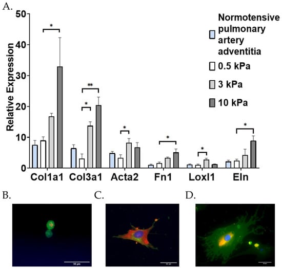 PAAFs expanded on plastic reverted from a myofibroblast to a fibroblast phenotype after three days of culture on 0.5 kPa stiffness 6-well plates, as assessed by their low expression of Acta2 (Appendix A, Figure A1) and their rounded appearance in culture (Figure 3B) compared with the more stellate shapes and higher Acta2 expression in cells grown on stiffer substrates (Figure 3C,D). Messenger RNA levels of Col1a1, Col3a1, Eln, Fn1, Loxl1, and Acta2 genes in fibroblasts cultured on 0.5 kPa substrates were not significantly different from those obtained by extracting RNA from the pulmonary artery adventitia of a normotensive rat (p > 0.05 by one-way ANOVA, Figure 3A). This finding suggests that cells cultured on a 0.5 kPa substrate may mimic expression of PAAFs in vivo with respect to the six genes studied in this paper.