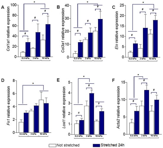 Effect of stiffness and stretch on gene expression in pulmonary arterial adventitial fibroblasts (PAAFs). Mean ± standard errors of the mean of mRNA levels relative to housekeeping control gene 18S ribosomal RNA in unstretched cells (n = 9, white bars) and after 24 h 10% equibiaxial stretch (n = 12, blue bars). * Significant pairwise effect of stiffness (p < 0.05) by a post-hoc Dunnett’s multiple comparisons test and # significant effect of stretch (p < 0.05) based on group comparisons made using a two-way analysis of variance (ANOVA) for: (A) Collagen I (Col1a1) (B) Collagen III (Col3a1) (C) Elastin (Eln) (D) Fibronectin (Fn1) (E) Lysyl oxidase-like 1 (Loxl1) (F) Smooth Muscle Actin (Acta2).