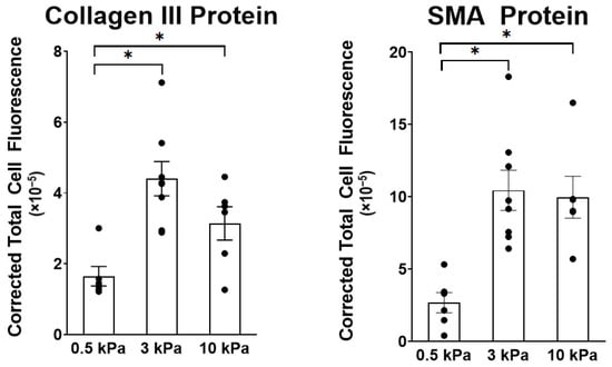 Effect of stiffness on protein expression of Collagen III and Smooth Muscle Actin (SMA) in PAAFs. Mean ± standard errors of the mean of Corrected Total Cell Fluorescence (CTCF) for 6–8 replicate hydrogels. * Significant pairwise effect of stiffness (p < 0.05) determined by one-way analysis of variance (ANOVA).