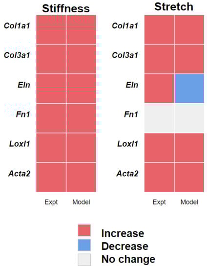 Comparison of the experimental observations (Expt) with model predictions (Model) of gene activity due to stretch and stiffness. Increase (red), decrease (blue), and no change (grey) in gene expression predicted by the model is based on a threshold of 0.1 and experimental observations that reached a significant difference 24 h after stretch (p < 0.05).