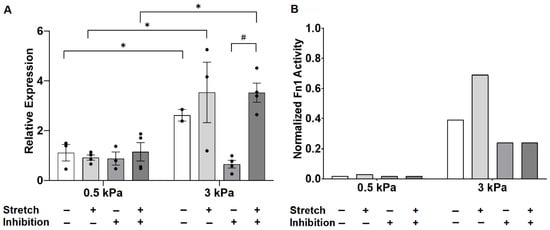 Losartan abrogated the induction of fibronectin mRNA expression by 3 kPa substrates compared with 0.5 kPa, and Fn1 expression by PAAFs grown on 0.5 kPa matrices remained unresponsive to stretch after 24 h (Figure 7A). Stretch significantly upregulated the expression of Fn1 by PAAFs grown on stiffer 3 kPa substrates when angiotensin II signaling was blocked.