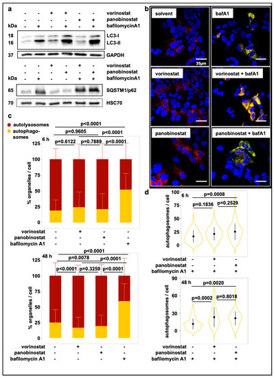 Vorinostat (Selleckchem, Houston, TX, USA, 1 M stock), panobinostat (Cayman- Biomol, Hamburg, Germany, 50 mM stock), bafilomycin A1 (Santa Cruz, Dallas, TX, USA, 10 µM stock), perifosine (Cayman—Biomol, 10 mM stock), rapamycin (Sigma-Aldrich, Munich, Germany, 1 mM stock), okadaic acid (Santa Cruz, Dallas, TX, USA, 1 mM stock) were dissolved in dimethyl sufoxide (DMSO). Chloroquine (CQ; Sigma-Aldrich, 100 mM stock) was dissolved in autoclaved Millipore H2O. If not otherwise specified, compounds were stored at −20 °C (vorinostat was stored at −80 °C) and protected from light.