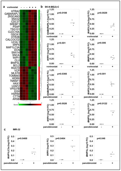 As vorinostat and panobinostat promote autophagic flux and are well-known modulators of gene transcription, we investigated the effect of these HDAC inhibitors on the expression of autophagy-related genes. The microarray expression analysis of genes with the ontology term “autophagy” (GO:0006914) revealed a significant upregulation of several autophagy genes in SK-N-BE(2)-C cells treated with vorinostat for 24 h (Figure 2a). Realtime RT-PCR analyses confirmed these findings for some selected genes (GABARAPL1, MAP1LC3a, WIPI1 and BNIP3L), as treatment with the both broad-spectrum HDAC inhibitors, vorinostat or panobinostat, resulted in upregulation of these genes in SK-N-BE(2)-C and IMR-32 neuroblastoma cells (Figure 2b,c). Of note, GABARAPL1 was not detectable in IMR-32 cells.